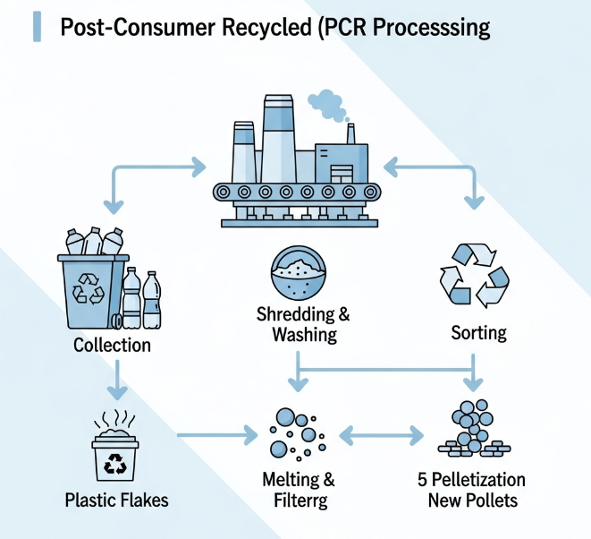 Kahulugan: Ang materyal ng PCR ay eksklusibong hinango mula sa mga produkto na ginamit ng mga end-consumer, na nakolekta sa pamamagitan ng itinatag na mga programa sa pag-recycle, at inilihis mula sa mga landfill o karagatan. Kabilang dito ang mga pang-araw-araw na bagay tulad ng mga ginamit na plastic na bote ng tubig, mga lalagyan ng yogurt, mga detergent jug, at mga aluminum can.