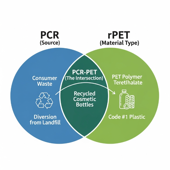 Ang pagkakaiba sa pagitan ng isang PCR Cosmetic Bottle at isang rPET Cosmetic Bottle ay isa sa saklaw at pinagmulan. Ang terminong rPET ay isang teknikal na paglalarawan ng kemikal na pagkakakilanlan ng plastic, habang ang PCR ay ang gintong pamantayan para sa pagtukoy sa etikal na pinagmulan nito.